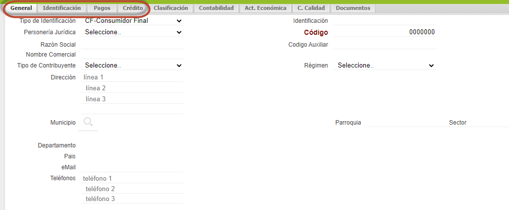 Se llena los datos necesarios en las siguientes pestañas GENERAL, IDENTIFICACION, PAGOS Y CREDITO.