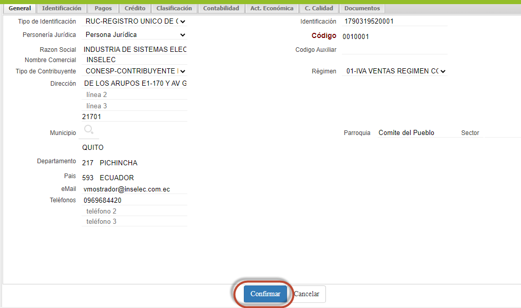 El Usuario para grabar la información ingresada del nuevo proveedor sebe pulsar CONFIRMAR.
