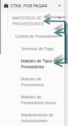 Seleccionamos en el Módulo de Cutas por Pagar en el menú Maestros de Proveedores, seleccionamos Control de Proveedores y seleccionamos Maestro Proveedores.